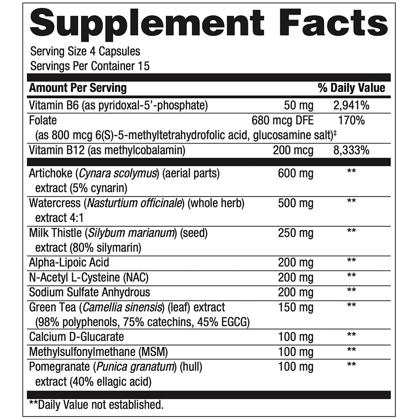 Su fórmula contiene ingredientes seleccionados para mejorar las actividades de las enzimas de desintoxicación hepática y apoyar las vías saludables de desintoxicación. El 5-MTHF en esta fórmula, Quatrefolic®, es la forma de folato más biológicamente activa, permitiendo una rápida absorción en el torrente sanguíneo. El 5-MTHF en esta fórmula también se conoce como la forma «L» de 5-MTHF ya que es la forma reducida de folato.