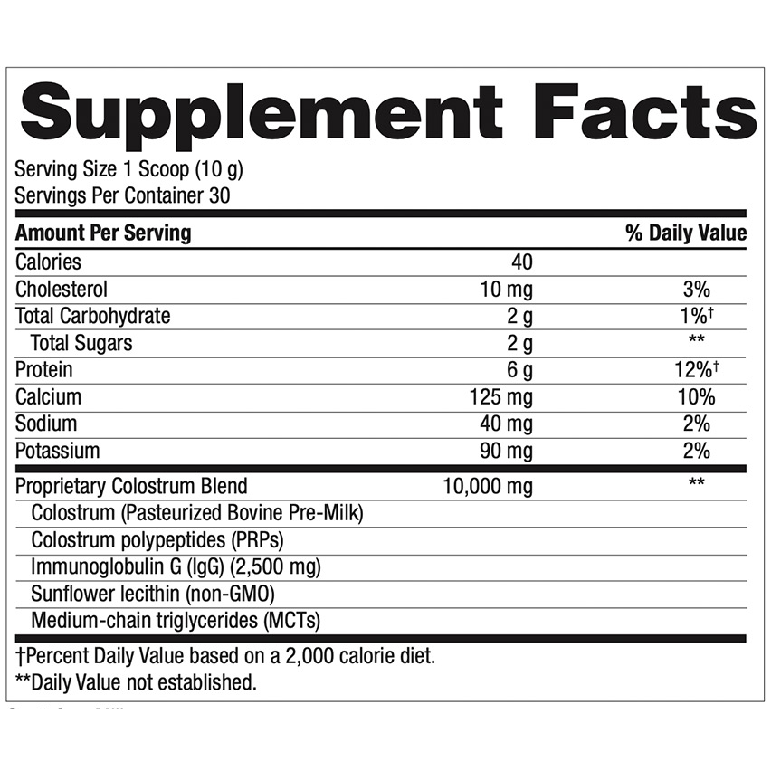 Esta fórmula es un alimento completo que proporciona immunoglobulinas IgG y polipéptidos de calostro, incluidos PRPs esenciales.* También suministra proteínas, factores inmunológicos, factores de crecimiento, vitaminas y minerales para garantizar la salud y vitalidad de manera natural.* Numerosos estudios científicos han demostrado que el calostro apoya el sistema inmunológico y de citoquinas en los seres humanos.*