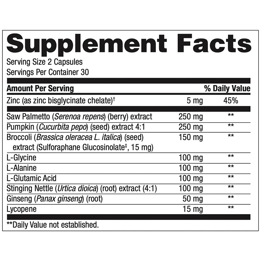 Incluye una combinación de aminoácidos que han demostrado en ensayos clínicos independientes promover la salud de la próstata y la función urinaria normal.* El saw palmetto (palma enana americana) apoya la función adecuada del tracto urinario y la próstata al favorecer la salud masculina.* El extracto de aceite de semilla de calabaza proporciona ácidos grasos esenciales, mientras que el extracto de raíz de ortiga ayuda a mantener un metabolismo hormonal saludable en las células de la próstata.* Además, esta fórmula contiene licopeno, un potente antioxidante que se encuentra en altas concentraciones en el tejido prostático saludable.* Se ha añadido zinc por su papel conocido en la función prostática saludable.*